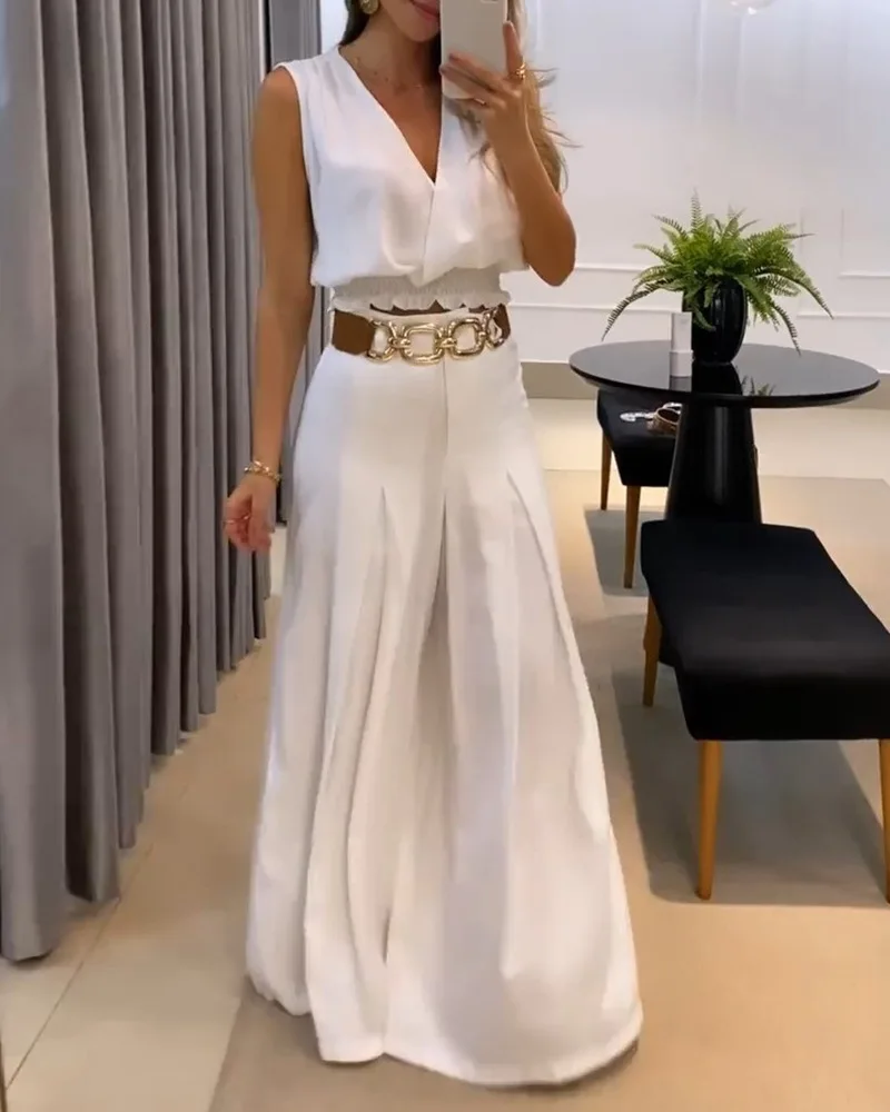 2024 Spring Summer New Women’s Clothing White Girdle Sleeveless V-neck Vest Wide-Leg Bell-Bottoms Suit-No Need Belt