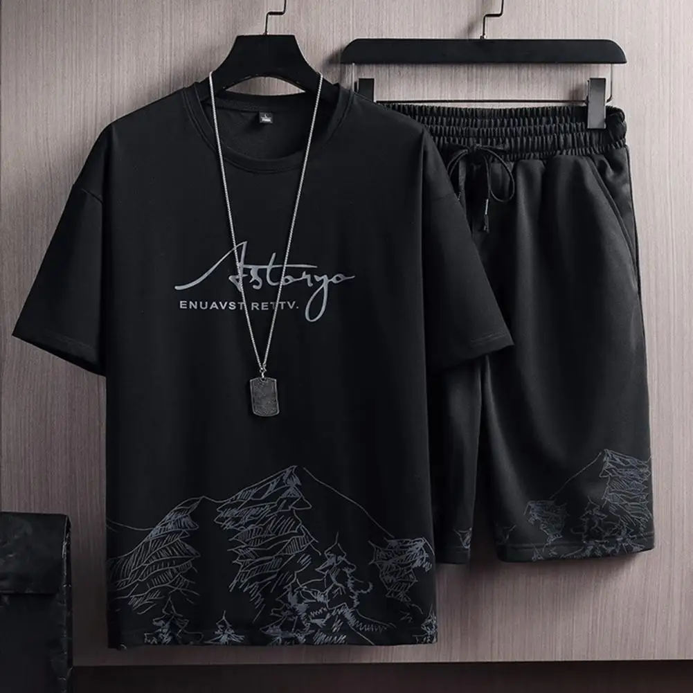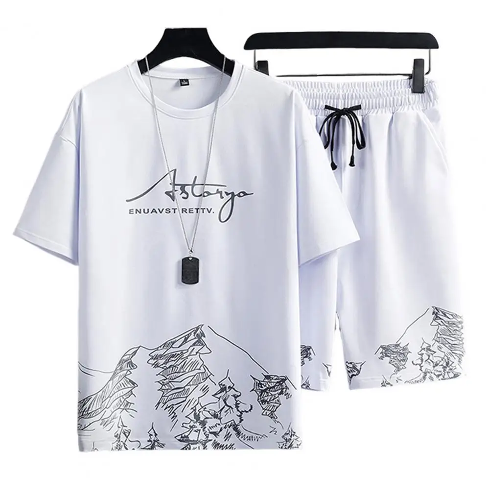 2Pcs/Set Casual Outfit Fashion Thin Sportswear Suit Mountain Print Loose T-shirt Loose Shorts Sport Suit Streetwear