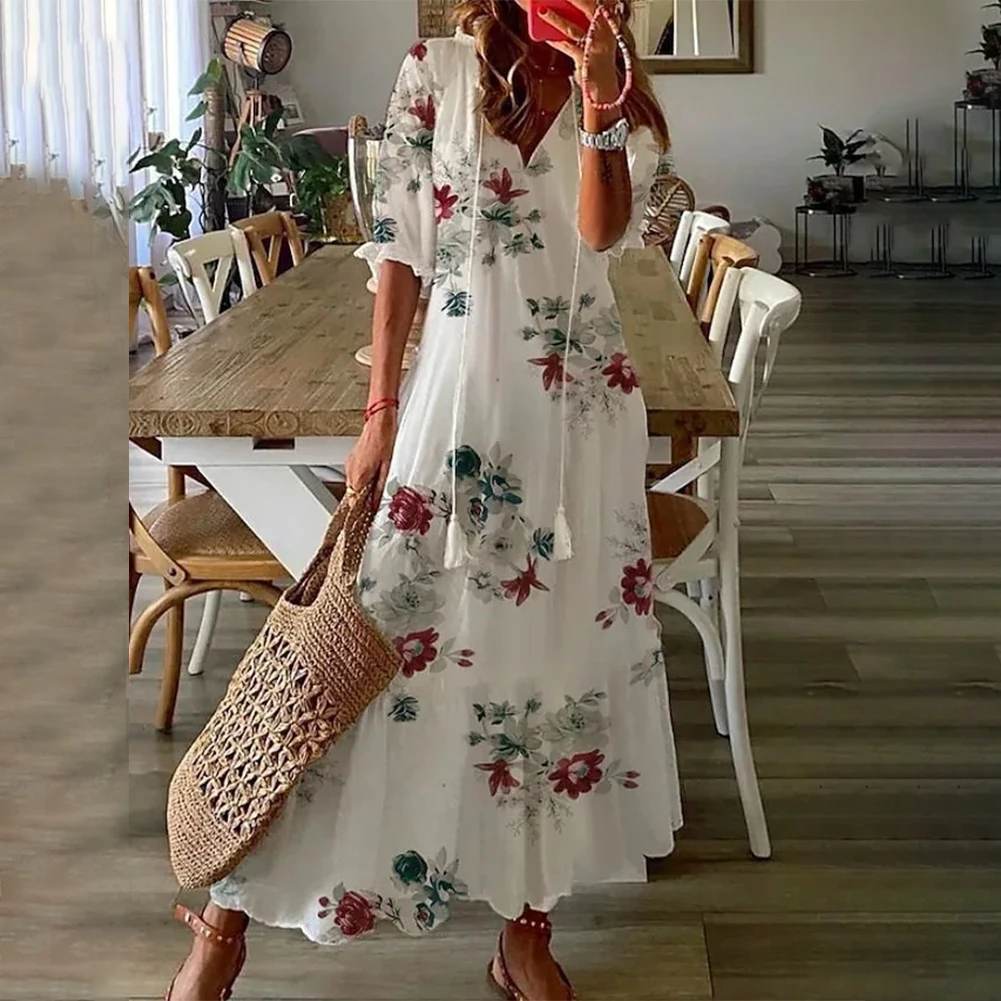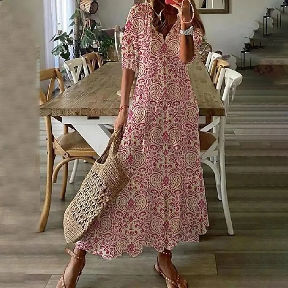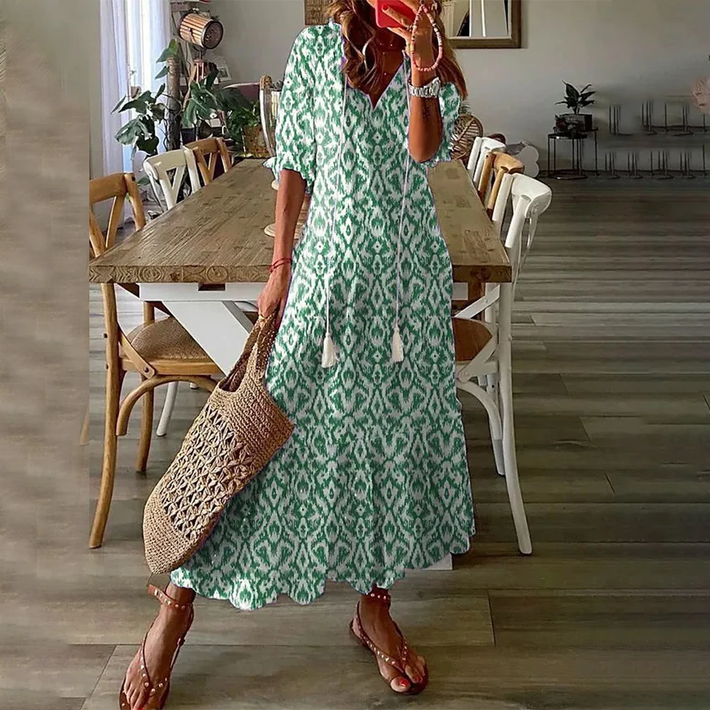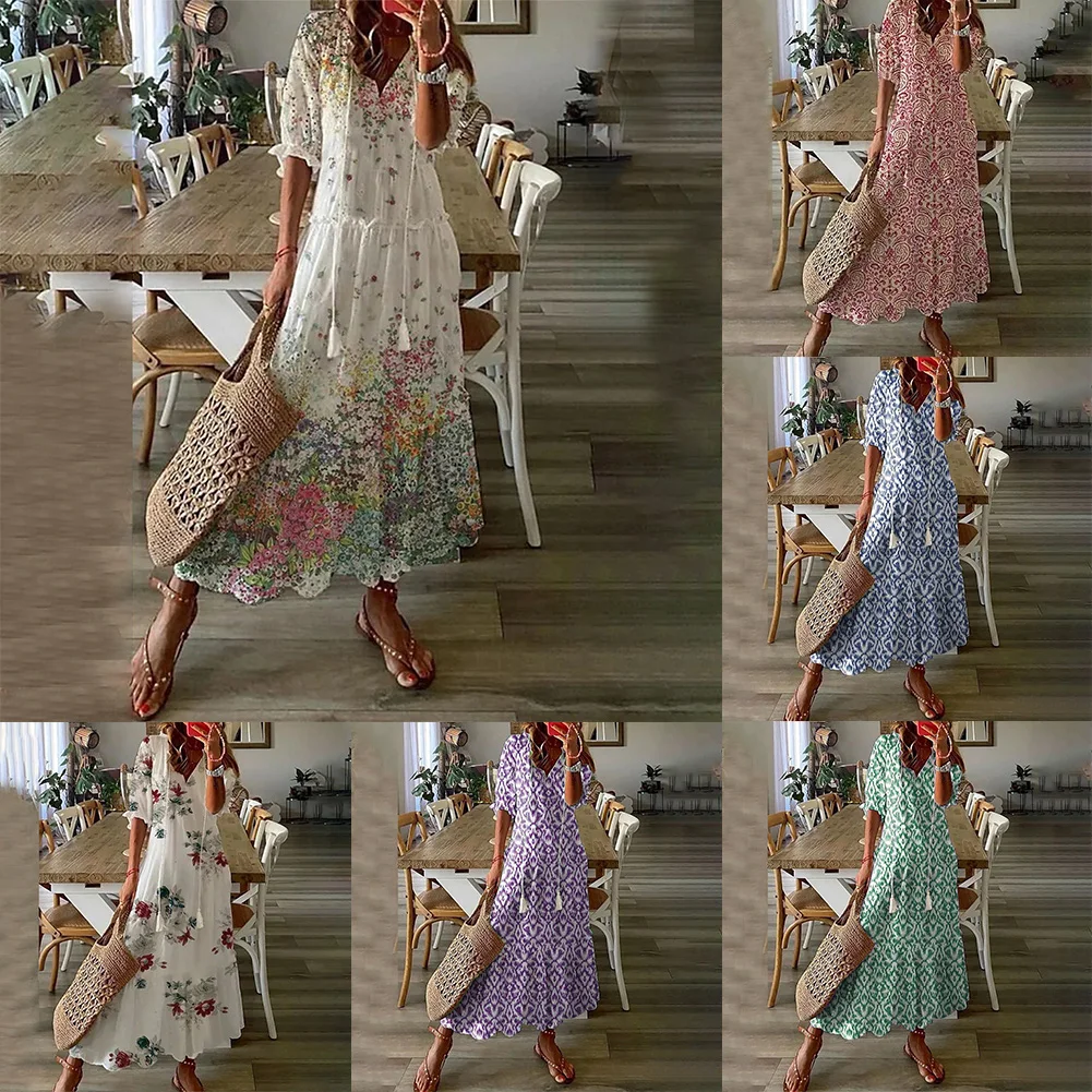 * Item Features:Women,Bohemian, Loose dress,V neck,Print,Half sleeved,Long dress,Maxi dress