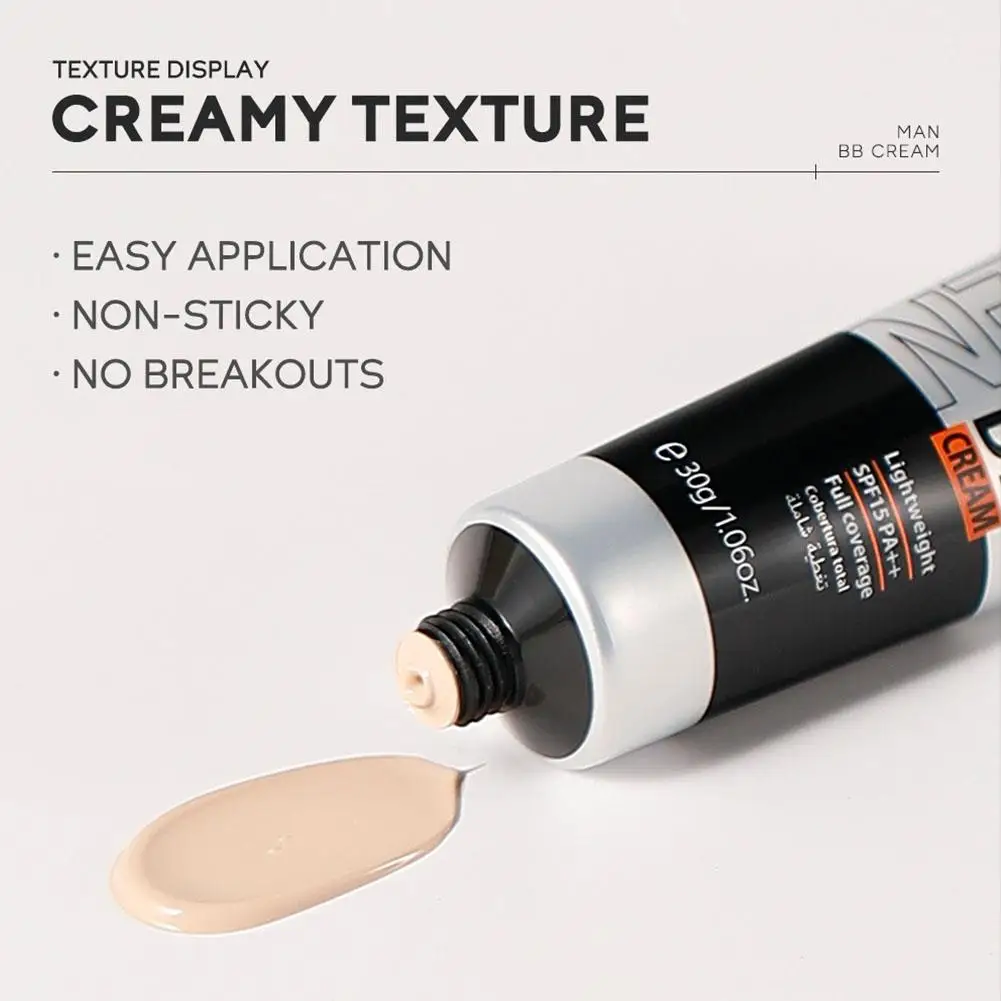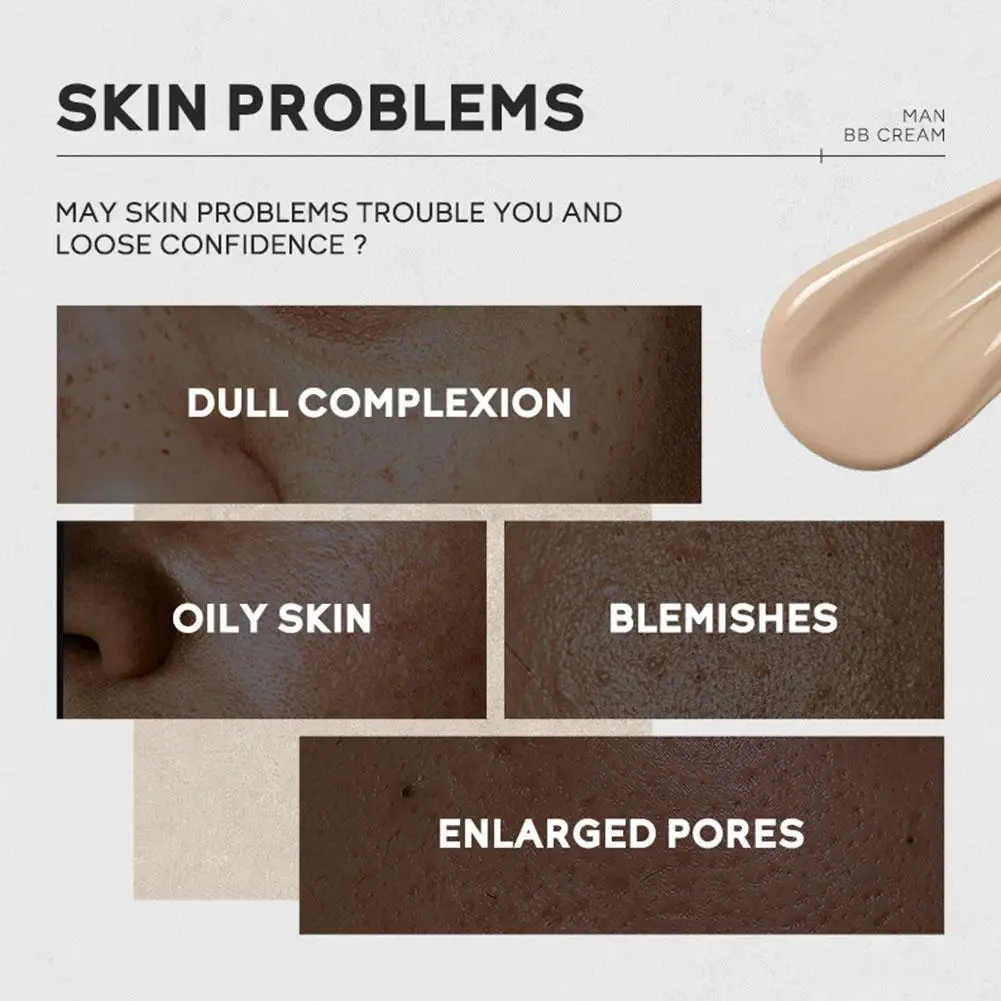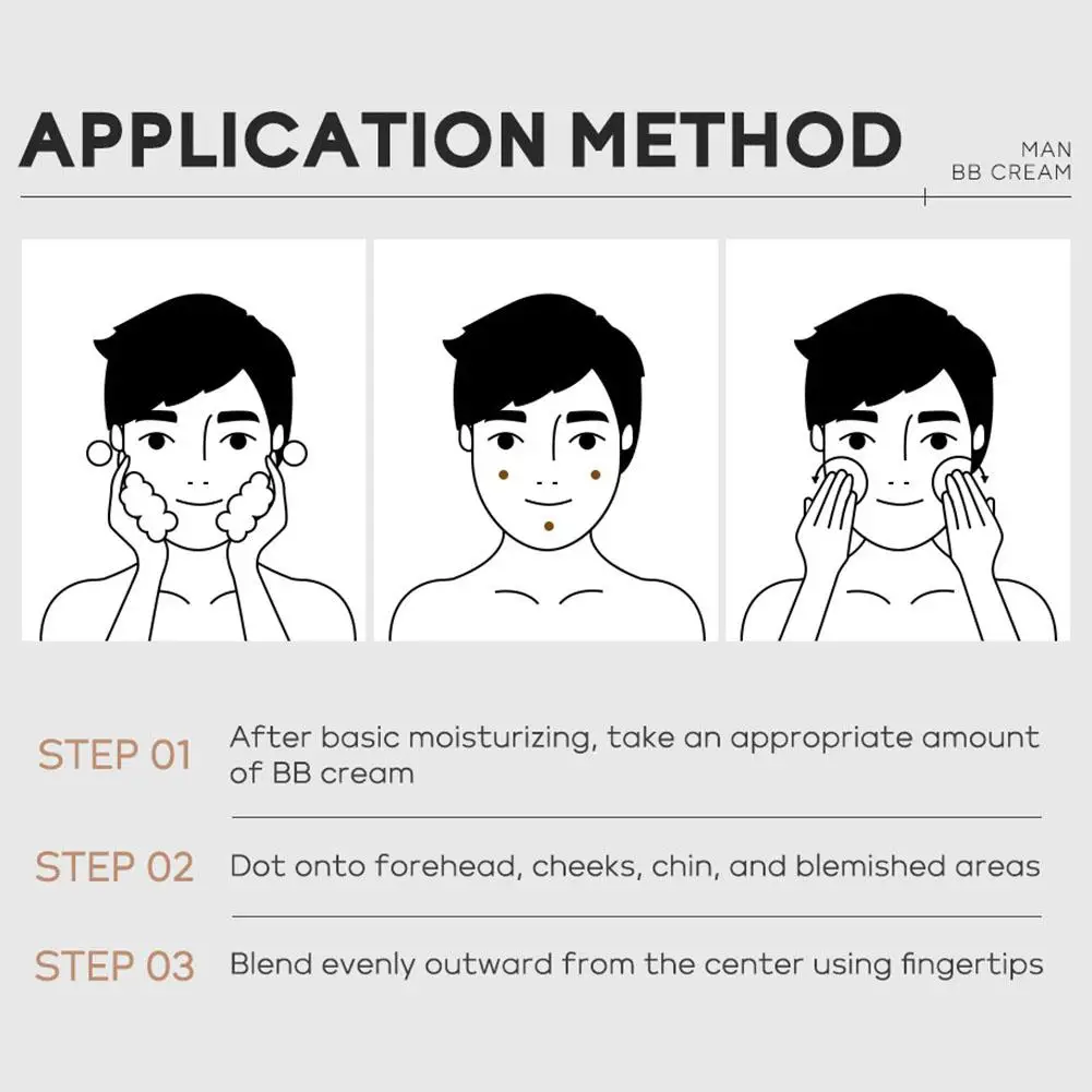 2. Multiple Effects: Men BB Cream can replace multiple skincare and makeup products, including sunscreen, essence, foundation cream, etc., with multiple effects such as moisturizing, correcting, concealing, etc., convenient and fast, one step to perfect.