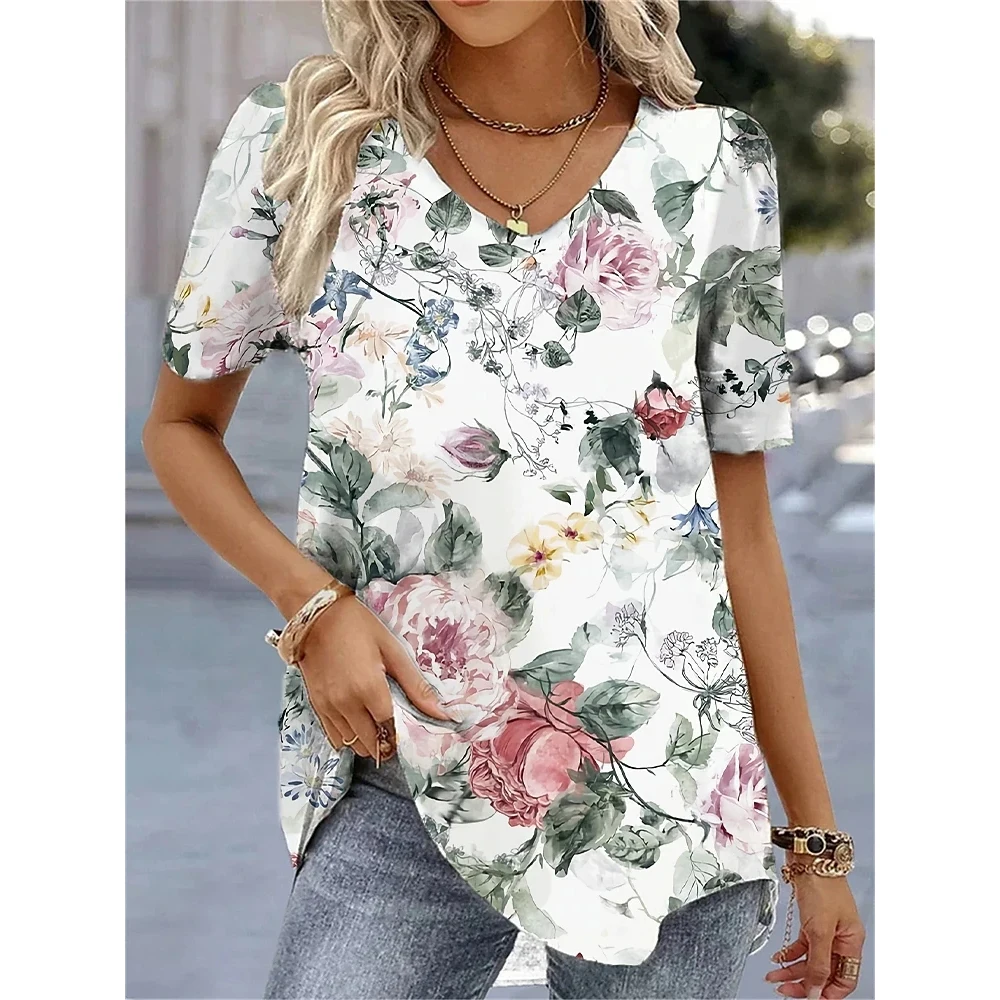 Women’s Flower T-shirt Fashion Crew Neck Clothing Casual Comfort Short Sleeved Summer Loose Breathable Top Women’s T-shirt
