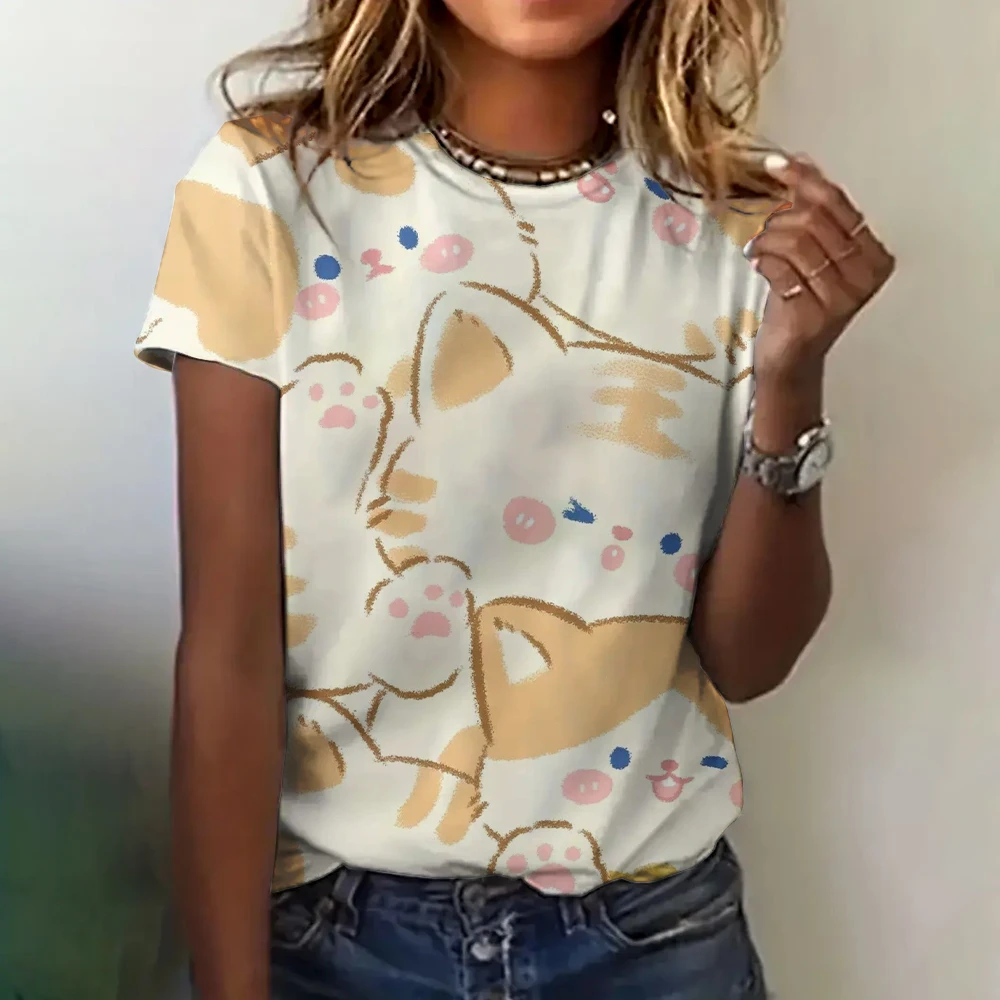 Women’s Fashion T-shirt Summer Crew-neck Clothing Elegant Casual Short Sleeve Cat Print Top Fashion Loose T-shirt Women Clothing